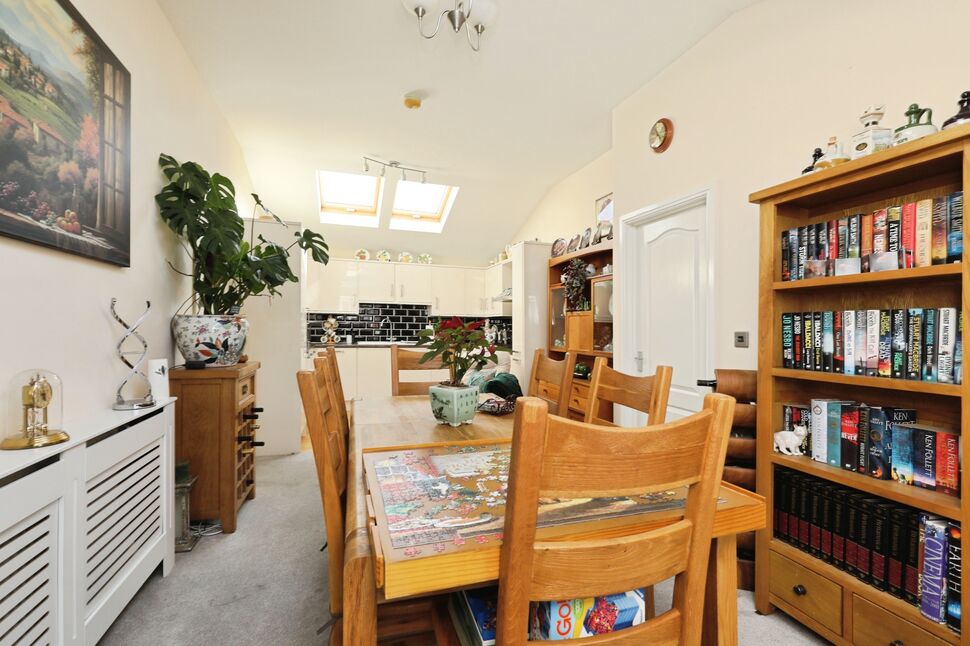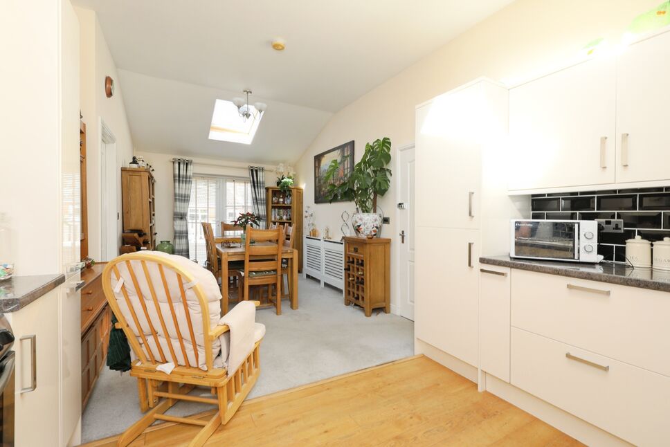 A great space for cooking, dining and entertaining! Briefly comprising; an extensive range of high gloss eye level and base units including pull out larder cupboard, sink and a half with drainer and mixer tap, complimentary splash back tiling, free standing electric cooker with cooker hood over, integrated fridge, wood flooring in the kitchen area, fitted carpet in the dining/living area, two Velux windows, central heating radiator and double glazed French doors providing access to the garden.