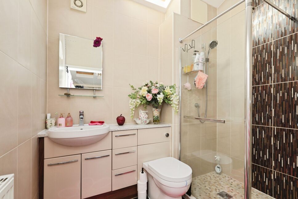 Briefly comprising; walk in shower with mains Mira shower, hand wash basin and W.C within a vanity unit, heated towel rail, extractor fan, fully tiled walls, tiled flooring, central heating radiator and Velux window.