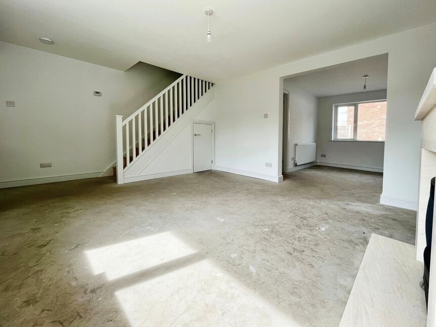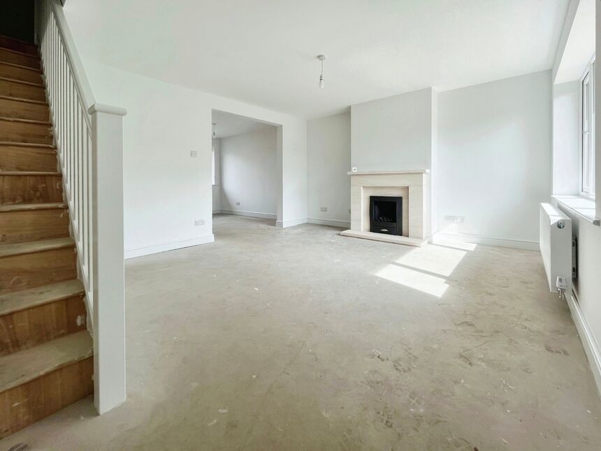 Central heating radiator, feature gas fireplace, staircase leading to the first floor with useful understairs storage cupboard and front facing double glazed window.