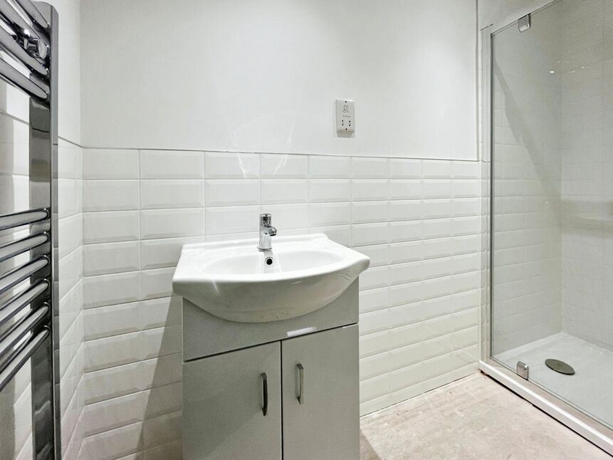Briefly comprising; shower cubicle with waterfall shower and shower head, hand wash basin with vanity unit below, heated towel rail, half tiled walls, spotlights to the ceiling, extractor fan and shavers point.