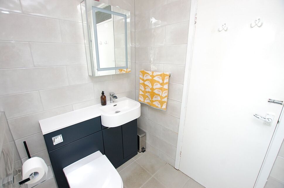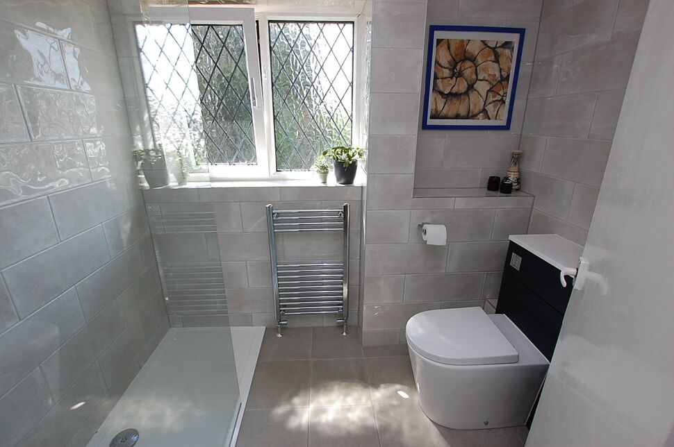 Fitted with a three piece suite comprising; walk-in shower cubicle, WC and wash basin set on a vanity unit, fully tiled walls and floor, radiator, UPVC double glazed window to rear aspect.