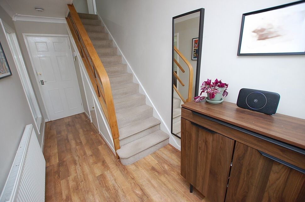 Radiator, stairs to first floor, understairs storage cupboard, door to dining room.