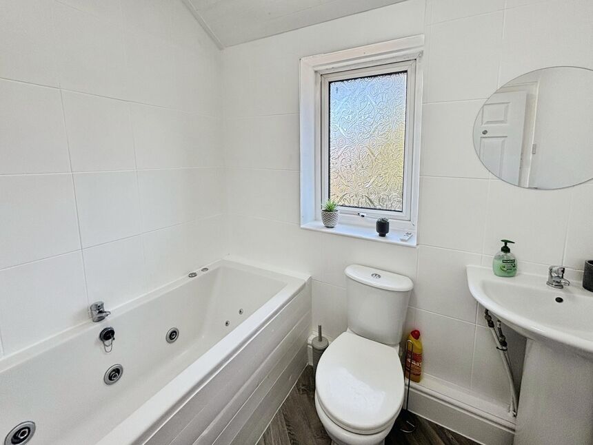 Three piece suite comprising of a Jacuzzi bath, pedestal wash hand basin and low level WC. Part tiled walls. Radiator and ceiling light point. Double glazed window.