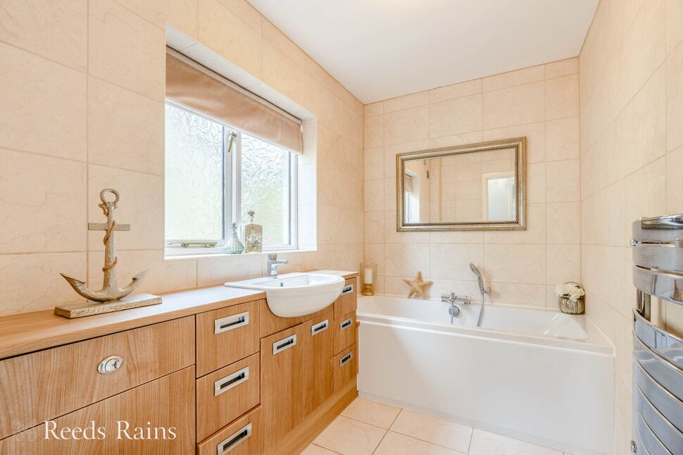 Double glazing to the side, attractive vanity sink with counter top with splashback tiles, w.c, heated towel rail, tiled floor and extractor fan.