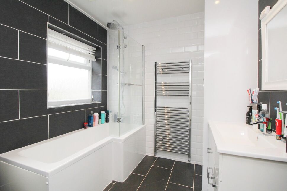 Modern bathroom suite, comprising a white low flush W.C., vanity wash hand basin, bath with shower unit overhead, tiled floor to ceiling, and a uPVC double glazed obscure window to the side elevation.