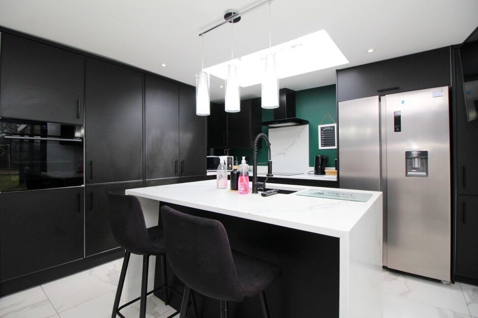 Kitchen is fitted with a range of modern wall, drawer and base units with marble worktop over, matching island with integrated slimline dishwasher, void for American fridge-freezer, sink with hose tap, four ring induction hob with extractor hood over and integrated oven. Finished off with Porcelain tiled flooring, inset LED lighting and skylight.The dining area has space for a nice size table and chairs, Porcelain tiled flooring, power points and uPVC double glazed bi-folding doors leading into the rear garden.