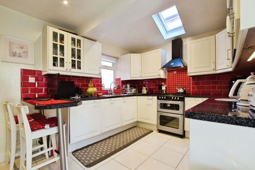 Step into a sleek and stylish culinary haven. The kitchen features high-gloss white wall and base units, perfectly complemented by a contemporary breakfast bar ideal for informal dining. Red oxford tile splash backs with multiple power points. Equipped with a gas cooker and extractor fan, an integrated microwave, and ample space for a fridge freezer, this kitchen combines functionality with elegance. A well-placed window to the side ensures the space is bathed in natural light, while a sink and drainer complete this idea kitchen set up.
