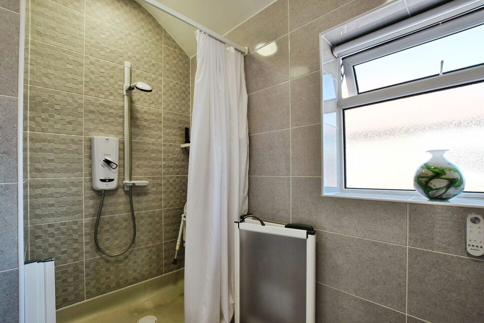Indulge in the luxury of a thoughtfully designed wet room, featuring a low-level WC, a sleek wash basin, and a spacious double walk-in shower. The room is finished with wet room flooring and wall tiling for a seamless, water-resistant surface. A double-glazed window allows natural light to flood the space, while ceiling lighting adds a modern touch to this elegant and functional bathroom.