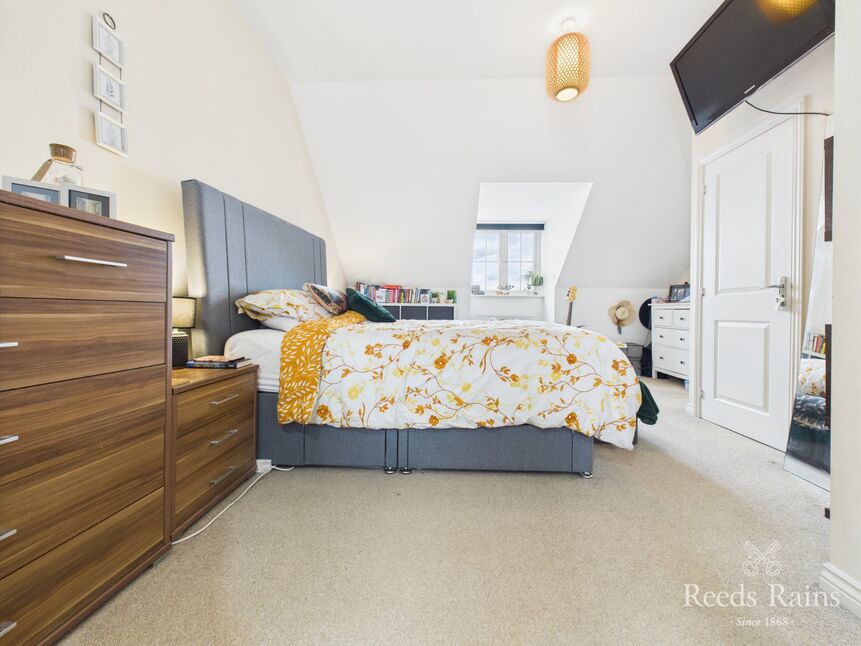 On the second floor, with built in storage, velux windows to the front and rear, and an ensuite, featuring a walk-in shower, a toilet, a sink, and a velux window to the rear.
