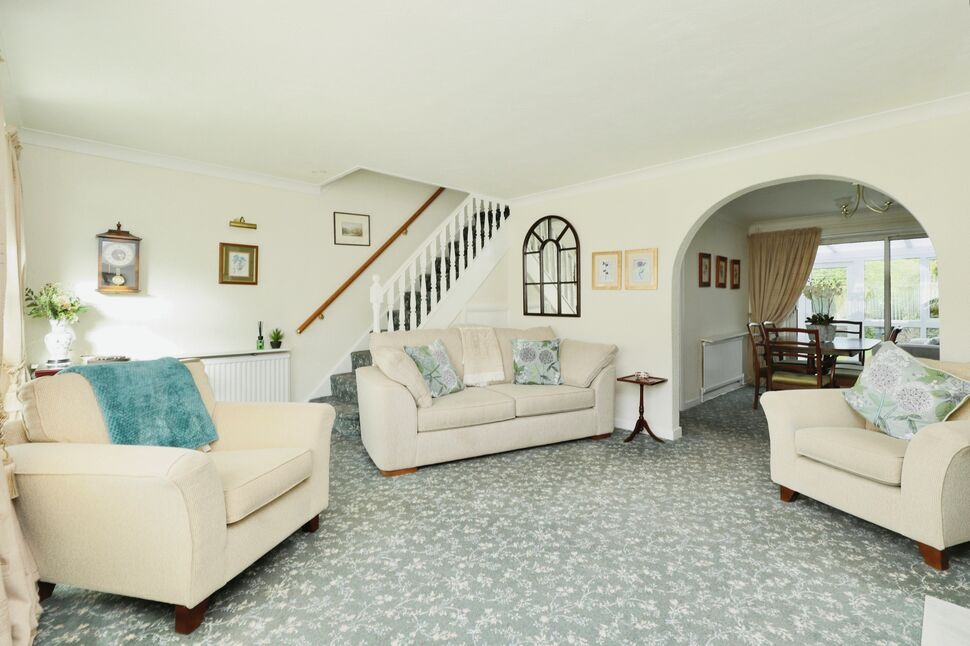 Front facing door providing access via vestibule with fitted carpet, central heating radiator, electric feature fireplace, staircase leading to the first floor with storage underneath, feature archway into the dining room and front facing double glazed window.
