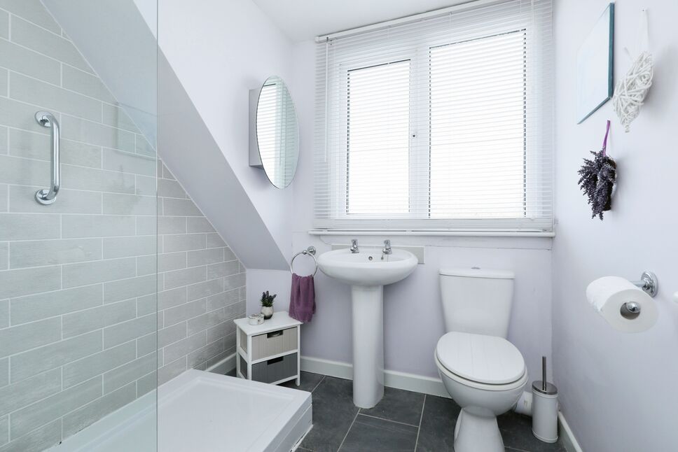 Briefly comprising; shower enclosure with electric shower, hand wash basin, W.C, central heating radiator, spotlights to the ceiling, tiled flooring and rear facing double glazed obscure window.