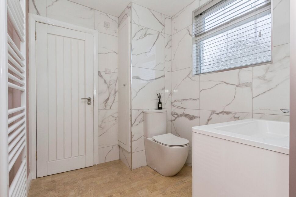 An exceptional bathroom suite to include a low flush wc, wall mounted basin with mixer tap and vanity unit, a freestanding bath with a handheld shower head and mixer tap. Furthermore, there is a large shower enclosure with a thermo controlled waterfall shower head. The bathroom has been finished with marble tile walls, and also includes two heated towel rails.