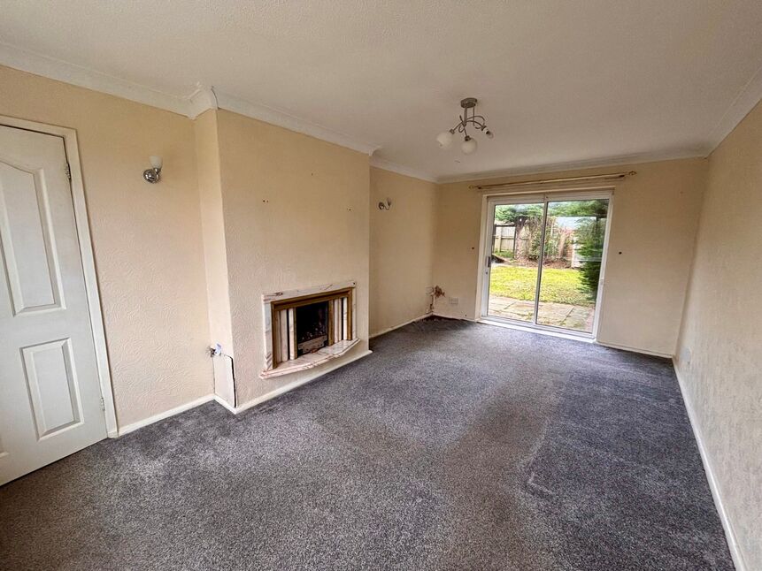 Spacious living room with window to the front, wall mounted radiator, fireplace and patio doors leading to the garden.