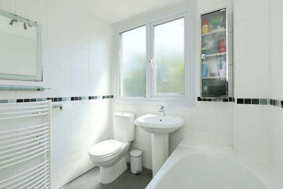 Briefly comprising; panelled bath with shower over, hand wash basin, W.C, heated towel rail, fully tiled walls, tiled flooring and rear facing double glazed obscure window.