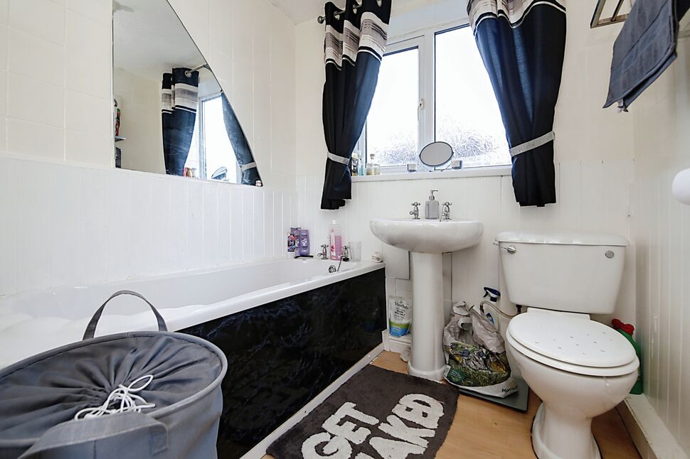 Low level flush toilet, hand wash basin and panel bath. Double glazed frosted window. Laminate style flooring.