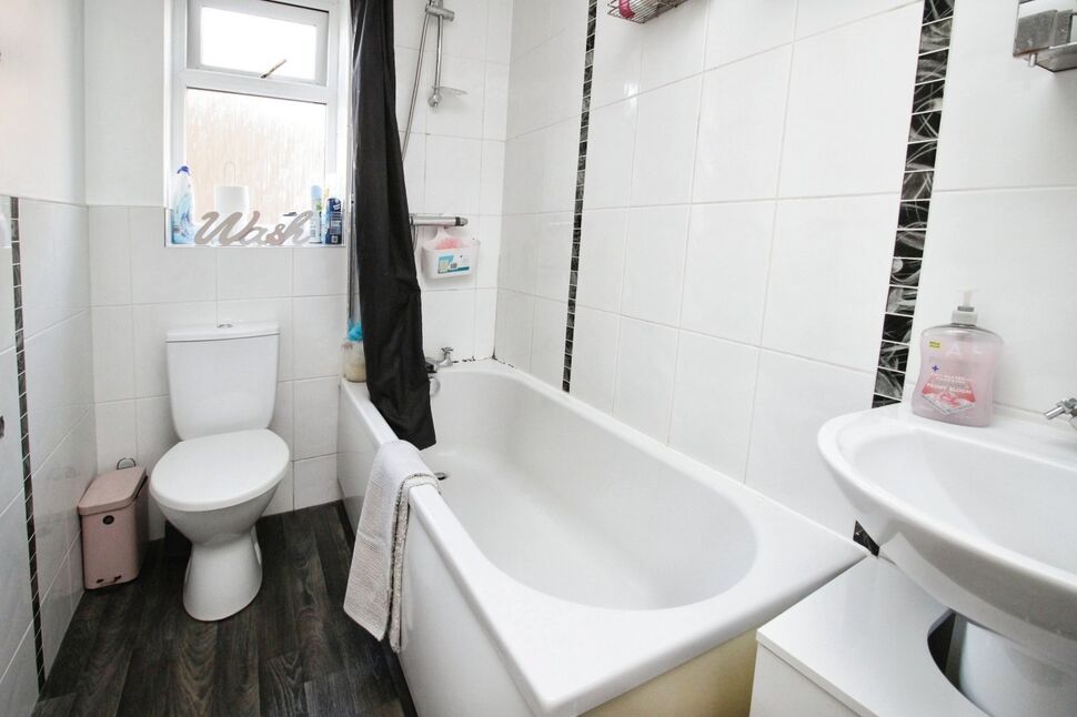 Side facing double glazed window. Three-piece suite comprising handbasin, WC and panelled bath with shower over. Part tiled walls. Extractor fan.