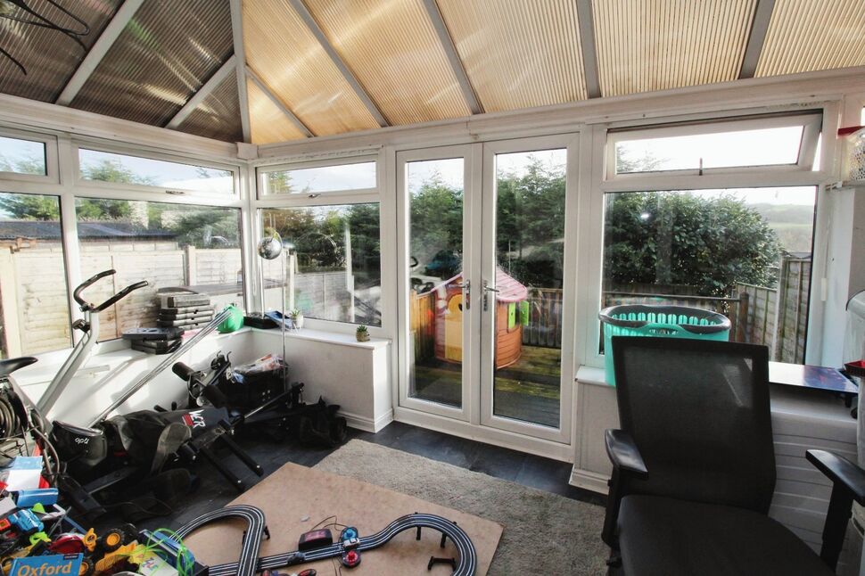 Double glazed dwarf wall conservatory with French doors leading to the garden. Radiator. Tiled floor.