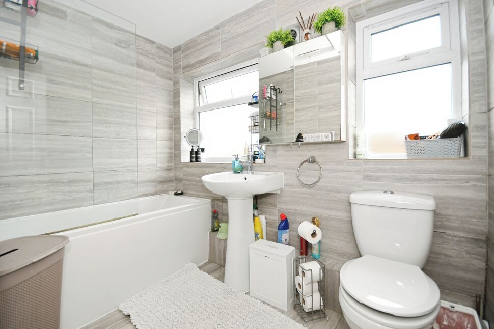 A three piece bathroom suite comprising of a shower, pedestal wash hand basin and a low level w.c. Heated towel rail, access to the loft and two double glazed windows to the rear elevation.