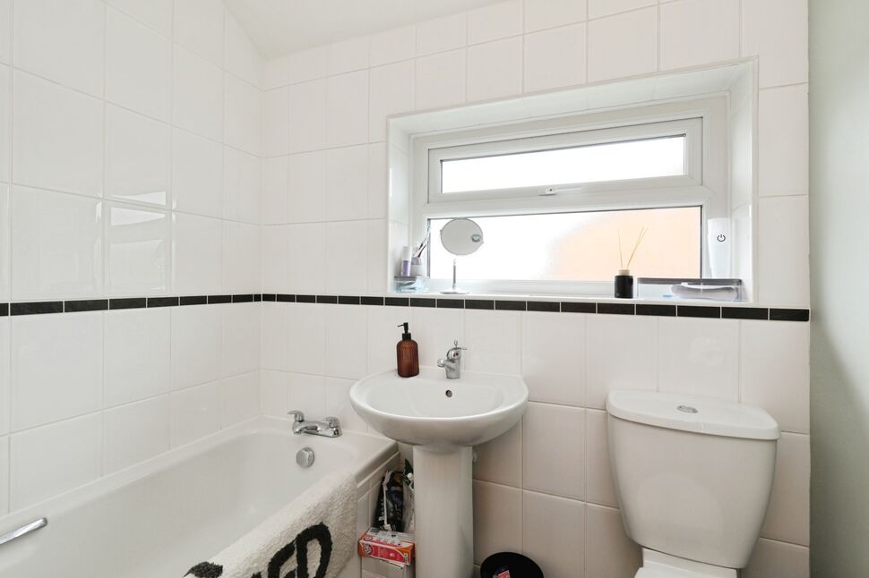 Briefly comprising; panelled bath with electric shower over and glass splashback screen, wash hand basin, W.C, heated chrome towel rail, three tiled walls, spotlights to the ceiling, extractor fan and rear facing double glazed obscure window.