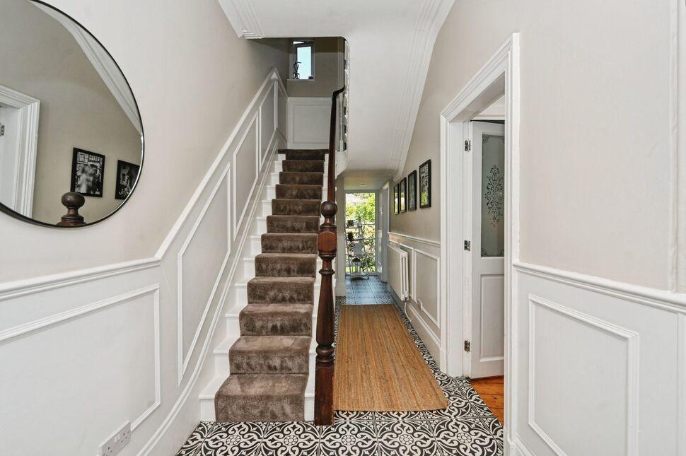 Original door with stained glass windows, half panelled hallway, original staircase leading to first floor, feature radiator and tiled flooring, original coving and ceiling rose' access to all reception rooms and access to cellar.