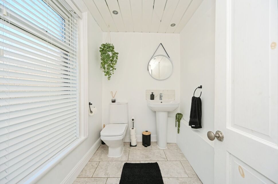 Double glazed frosted window to the rear, lower level W.C, pedestal wash hand basin and tiled flooring.