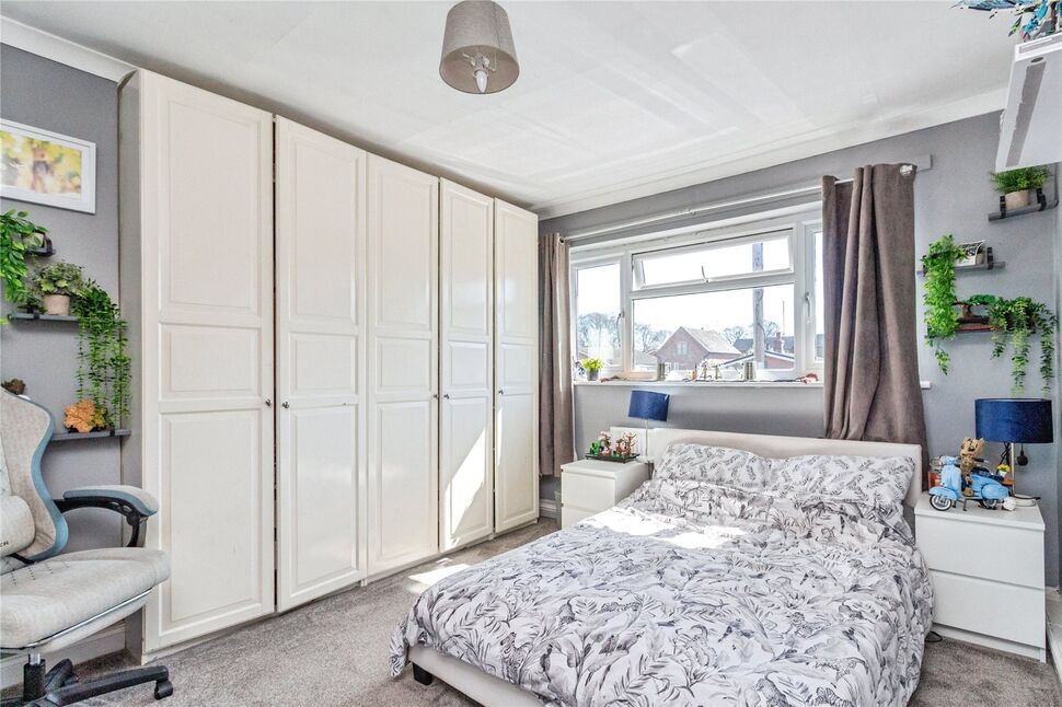 Bedroom one is a spacious double room which is positioned at the rear of the property for ultimate privacy and peace, it also offers views overlooking the back garden. The room features fitted wardrobes that provide ample storage, seamlessly blending functionality with style. Neutrally decorated, the room offers a modern aesthetic which is complemented by grey carpets, creating a cosy atmosphere ready for your personal touch.