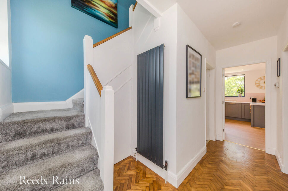 Decorative, leaded effect double glazed entrance door. Original parquet wood flooring. Vertical radiator. Staircase to the first floor with understairs storage cupboard. Decorative leaded effect UPVC double glazed window to the front.