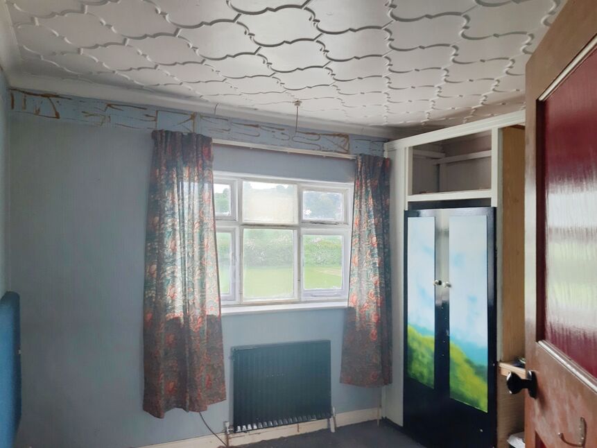 A feature brick fire surround with a gas fire inset, a central heating radiator and a window overlooks the front aspect. Single glazed French doors open to the dining room.