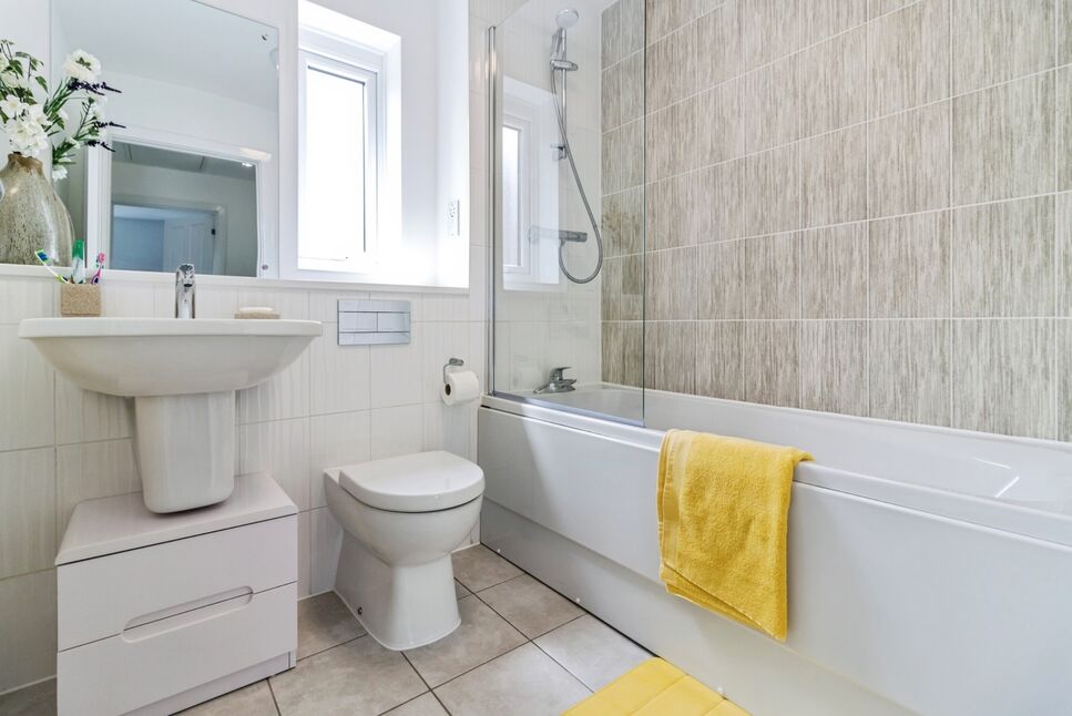 With obscure window to the rear elevation, panelled bath with shower over, wash basin with mixer tap, WC, shaver point, tiled splashbacks and flooring, radiator.