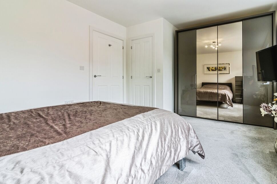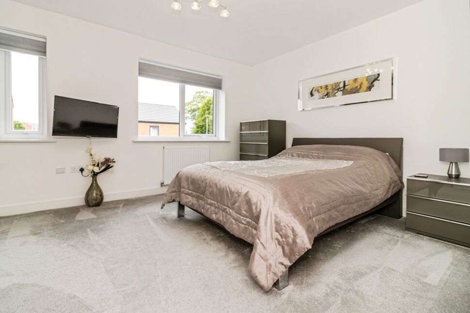 A spacious main bedroom with two windows to the front elevation, carpeted floor, radiator and linen cupboard.