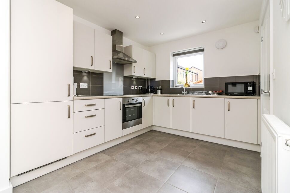 Offering a flexible open-plan layout ideally suited to modern lifestyles, spanning the full length of the property with windows to the front and rear elevations. The living area is carpeted with a radiator and good-sized understairs storage cupboard with light. To the rear is the kitchen, featuring a range of contemporary base and wall units, electric oven and hob with extractor hood, 1.5 bowl sink with mixer tap, worktop lighting, tiled splashbacks, integral fridge/freezer, recessed spotlights, tiled flooring and a further radiator. Door to: