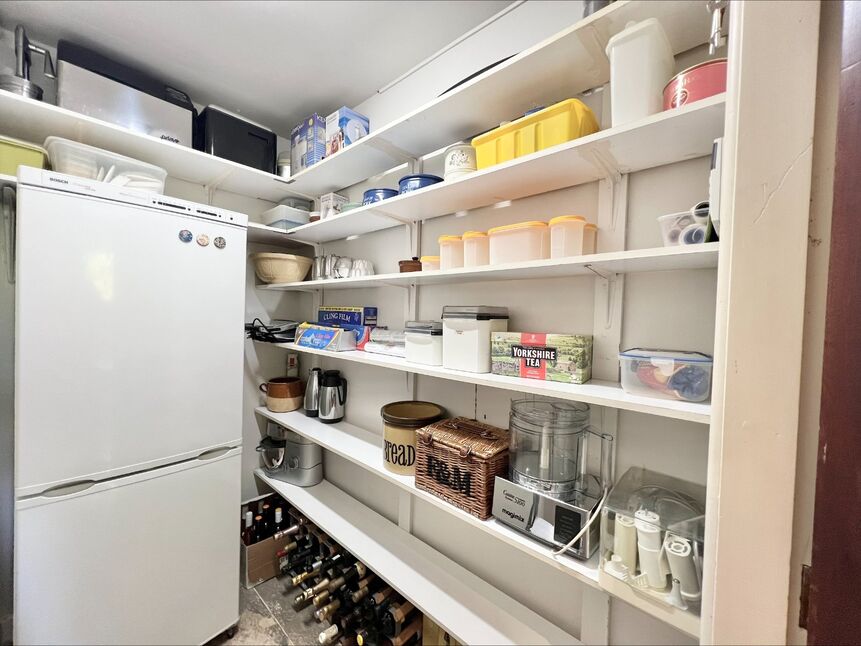 A very useful walk in pantry with a space for upstanding fridge freezer and range of shelves ideal for storing food and wine, security alarm system and the valuables safe.
