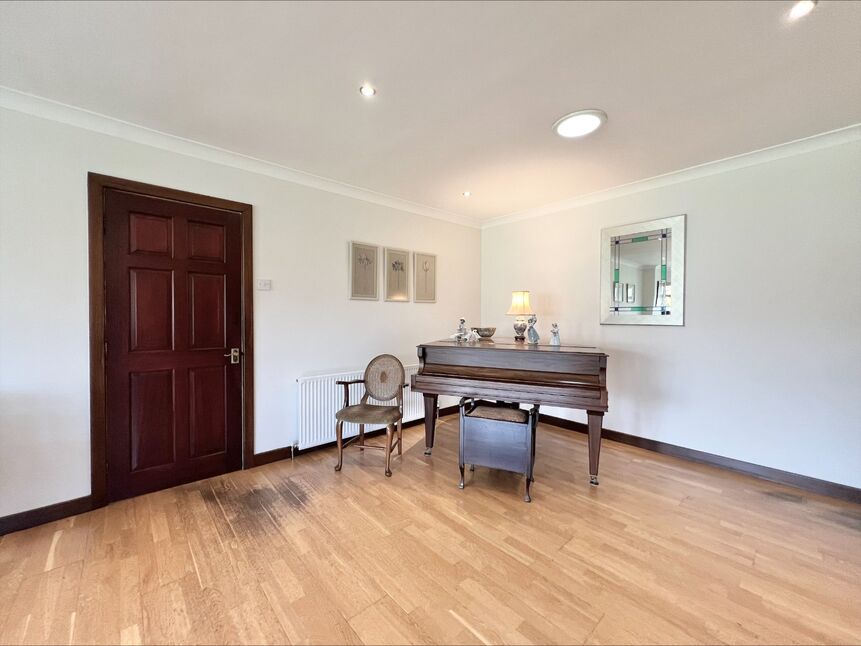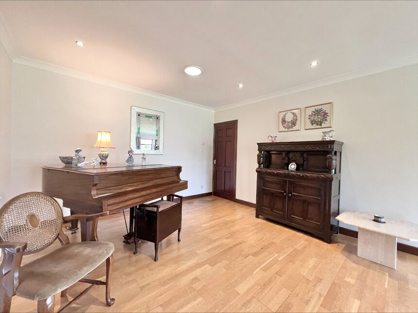 A fabulous and very spacious open plan entertaining lounge/sitting room and adjoining piano/music room.Tasteful neutral decor with contrasting solid wood floors and ample light from the double glazed windows overlooking the private rear gardens.