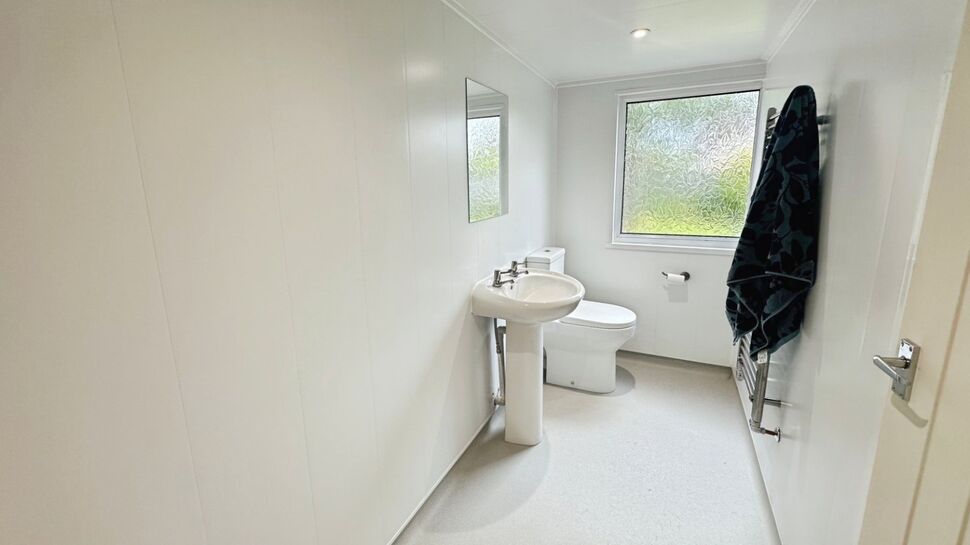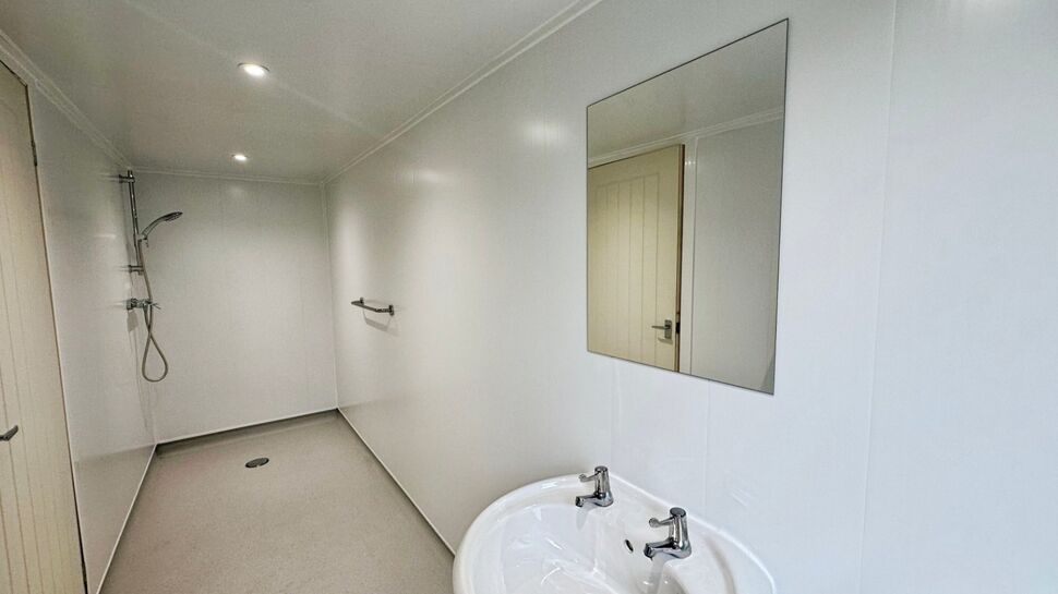 The first floor hosts three bedrooms; two doubles and one single room. All are neutrally decorated, and the family shower room includes a w/c, wash basin, and walk-in shower.