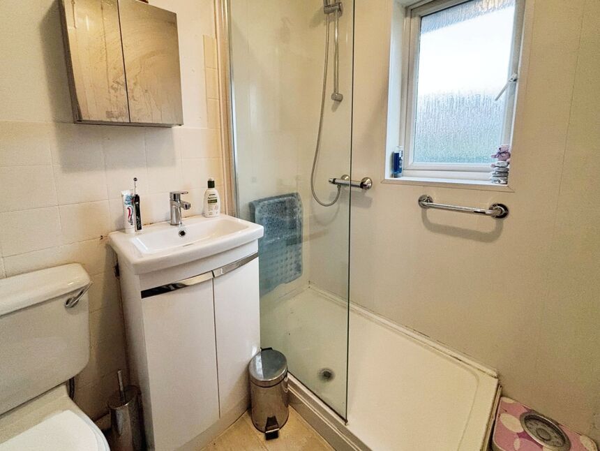 Three piece suite comprising of a shower cubicle, vanity wash hand basin and low level WC. Part tiled walls. Ceiling light point. Double glazed window to the rear aspect.