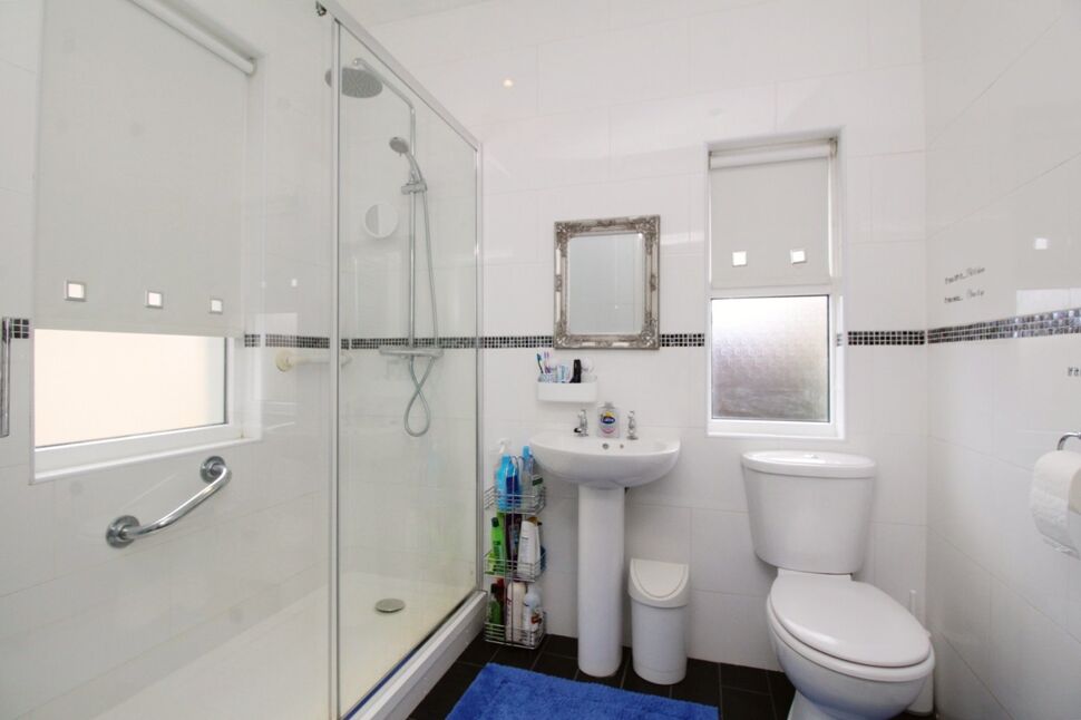 Comprising a modern, white three piece suite having a low flush W.C., pedestal wash hand basin, large walk in shower enclosure with shower unit overhead, chrome heated towel rail, tiled walls, inset lighting and two uPVC double glazed obscure windows.