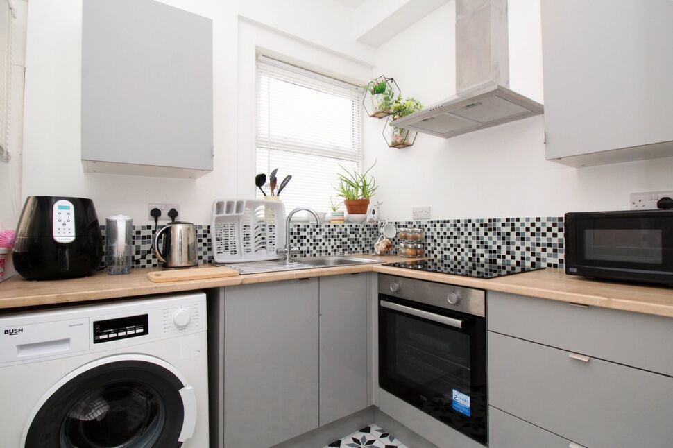 Fitted with a range of modern wall, drawer and base units with worktops over, stainless steel sink with drainer, integrated Beko oven with four ring Beko electric hob with stainless steel extractor hood over, plumbing for washing machine, power points, decorative vinyl flooring, two uPVC double glazed windows and timber glazed door giving access into the rear garden.