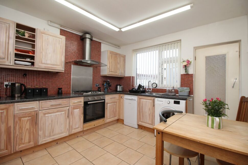 Fitted with wall, drawer and base units with work top over one and a half stainless steel sink with drainer, integrated oven with four ring gas hob and extractor hood over, integrated washing machine, integrated slimline dishwasher, void for free standing fridge/freezer, tiled flooring, radiator, power points and uPVC double glazed window and door leading into the rear porch.