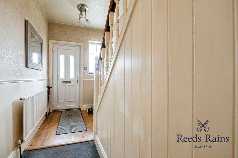 Step through the double-glazed entrance door flanked by side panel window into a particularly inviting space. The entrance hall combines practicality and warmth, with a spindled staircase ascending to the first floor, a convenient built-in storage cupboard, ceiling coving and dado rail. The flooring is thoughtfully finished with a blend of durable laminate and cosy carpeting, setting the tone for the rest of this welcoming home.