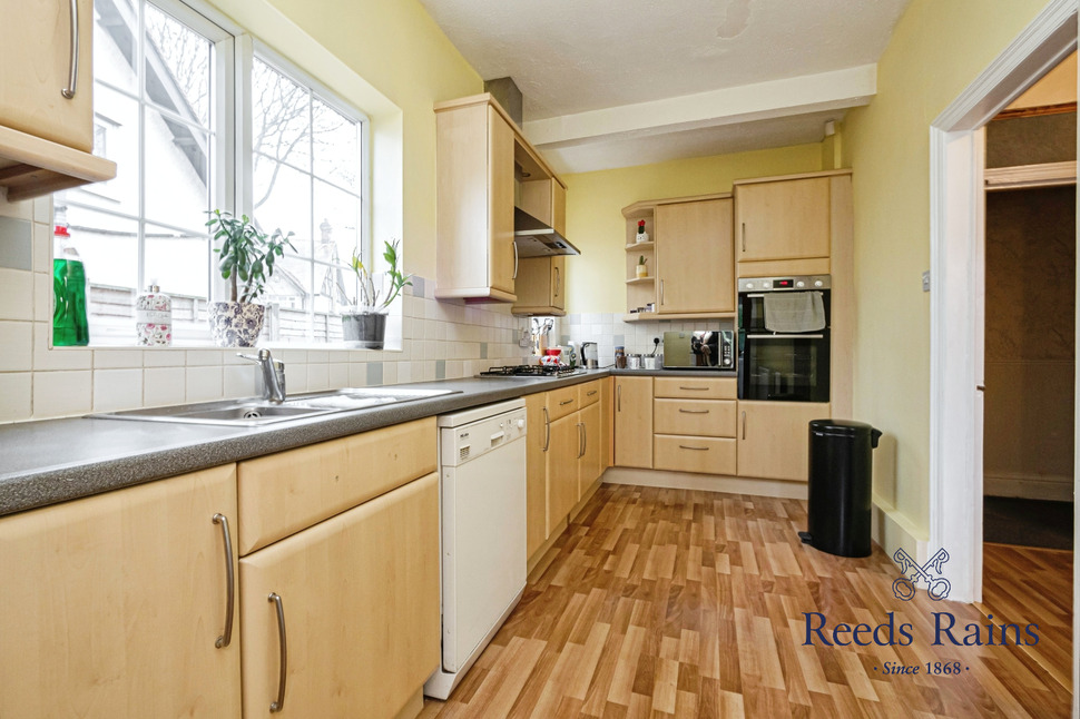 The kitchen is both stylish and functional, featuring an excellent arrangement of base and wall-mounted cabinets with cupboards and drawers. Complemented by laminated work surfaces, ceramic-tiled splashbacks, and a stainless steel sink with a mixer tap, the kitchen is designed for practicality and ease. Cooking is a delight with the four-ring stainless steel gas hob, extractor hood with chimney-style canopy, and built-in high-level oven. The space is finished with a laminate floor and a radiator.