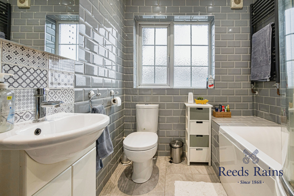 The recently transformed bathroom is a showstopper, appointed with a luxurious three-piece suite in white. It features a 'P' shaped panel bath with a fitted shower screen, a wash hand basin integrated into a vanity unit with storage, and a low-flush WC. Extensive ceramic tiling on the walls and floor creates a sleek, modern look, while a heated towel rail adds a touch of indulgence.