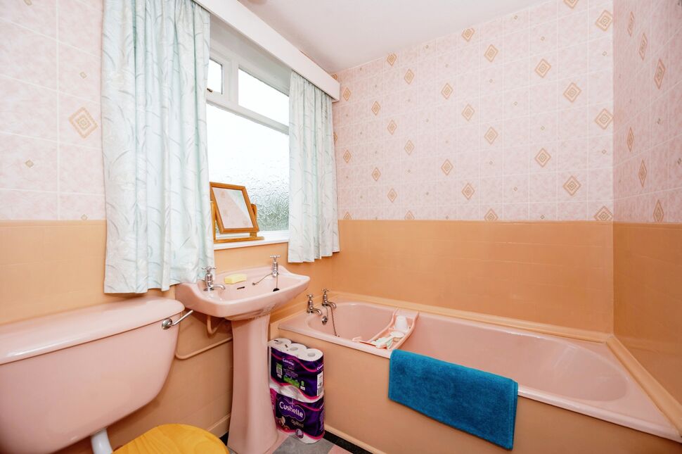 Bath, pedestal wash basin, low level w.c, frosted UPVC window to rear.