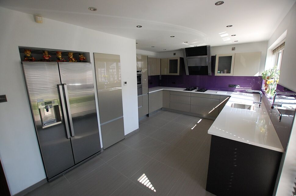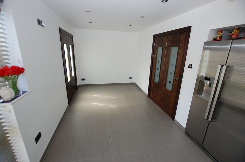 Fitted with an extensive range of base and wall units by Kuchen Haus German Kitchen, complemented by quartz worktops. Inset stainless steel sink with mixer tap over, NEFF appliances including single and double gas hob, warming drawer, integrated oven/grill with stainless steel extractor hood over, spaces for dishwasher, dryer and washing machine, electric underfloor heating, fully tiled floor, UPVC door to rear aspect, double doors to conservatory.