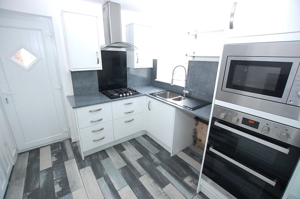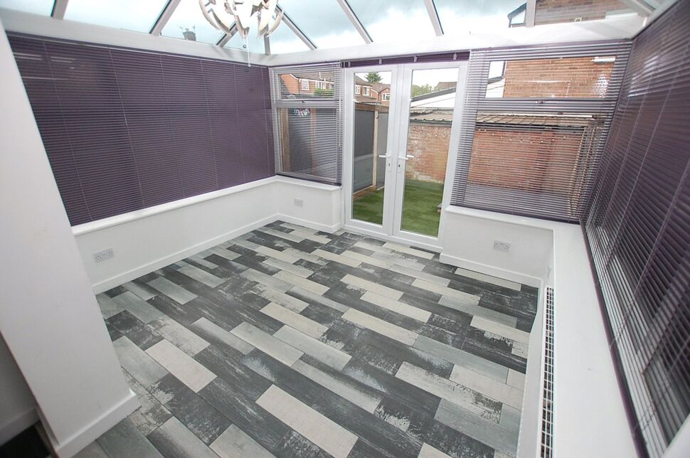 Fitted with a range of white base units and wall mounted storage cupboards complemented by laminated worktops, double oven and grill, integrated microwave, four ring gas hob with extractor hood over, one and a half bowl sink and drainer with mixer tap over, space for washing machine, understairs storage cupboard, UPVC door to side aspect, open to conservatory.