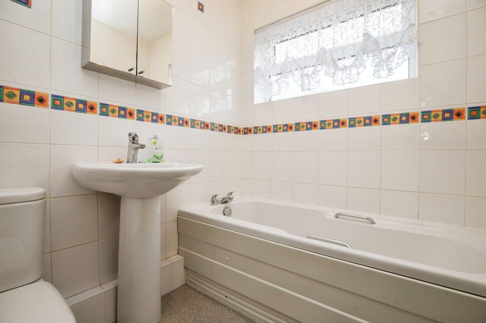 Side facing double glazed window. Three-piece suite comprising hand basin, WC and panelled bath. Tiled walls. Heated towel rail.