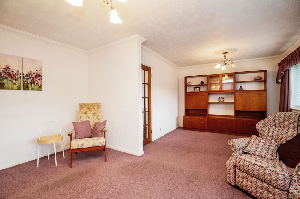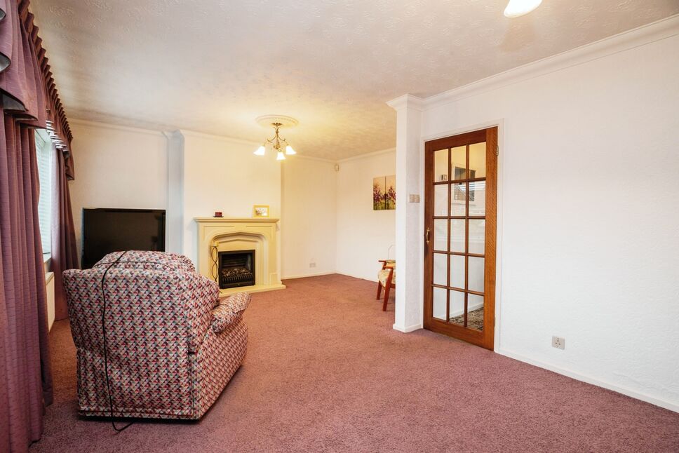 Large L-shaped lounge with two front facing double glazed windows. Two radiators. Living flame coal effect gas fire with surround and mantelpiece. Coved ceiling. TV point.