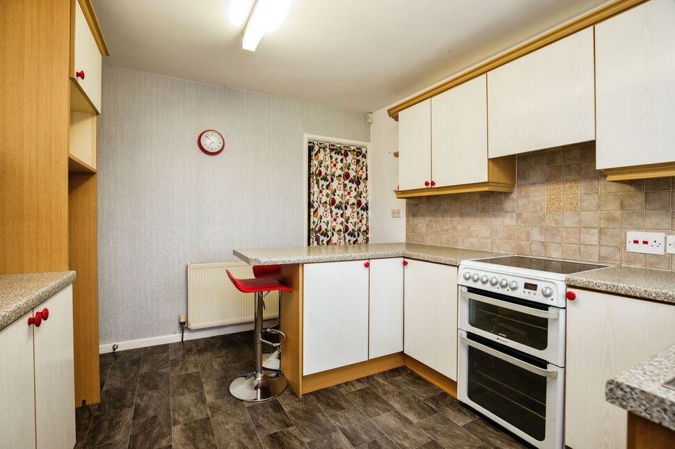 Rear facing double glazed window and double glazed door leading to the garden. Range of wall and base units with workshop surfaces, breakfast bar and stainless steel single drainer sink unit. Electric oven point. Plumbed for washing machine. Part tiled walls. Radiator. Under stairs storage cupboard.