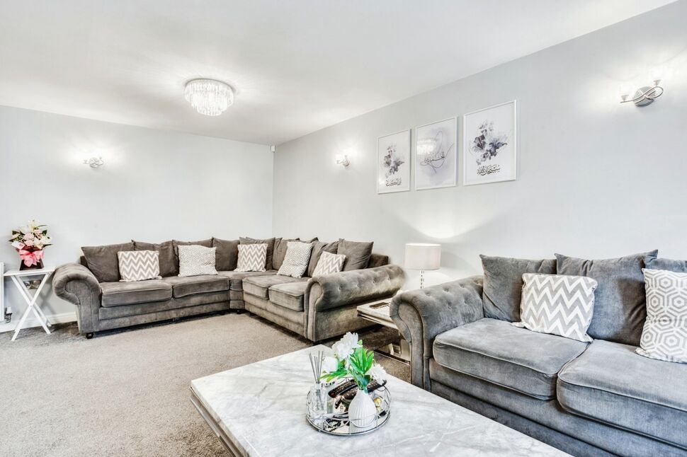 Front reception room with carpeted floor, two gas central heating radiators, two uPVC double glazed windows to the front elevation, wall lights and ceiling pendants.
