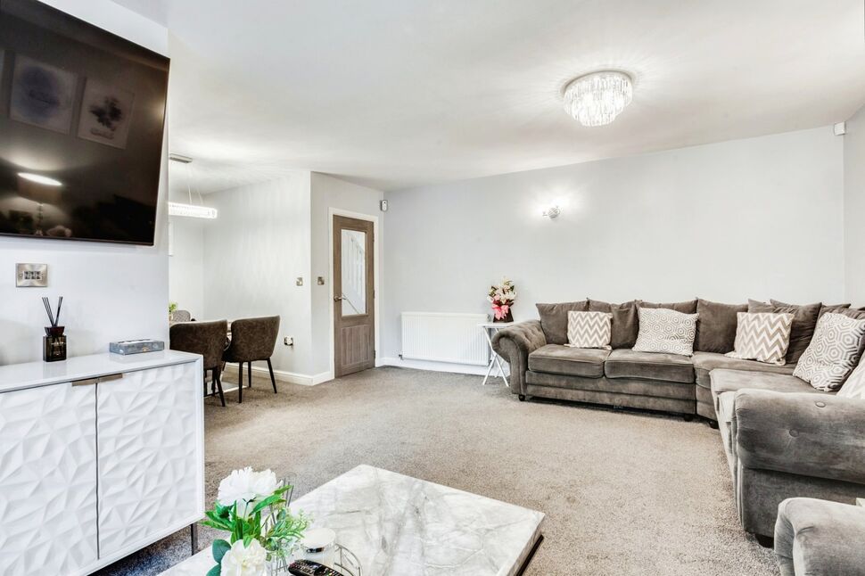 Open plan rear reception room with carpeted floor, gas central heating radiator, uPVC double glazed window to the rear elevation, wall lights and ceiling pendants.