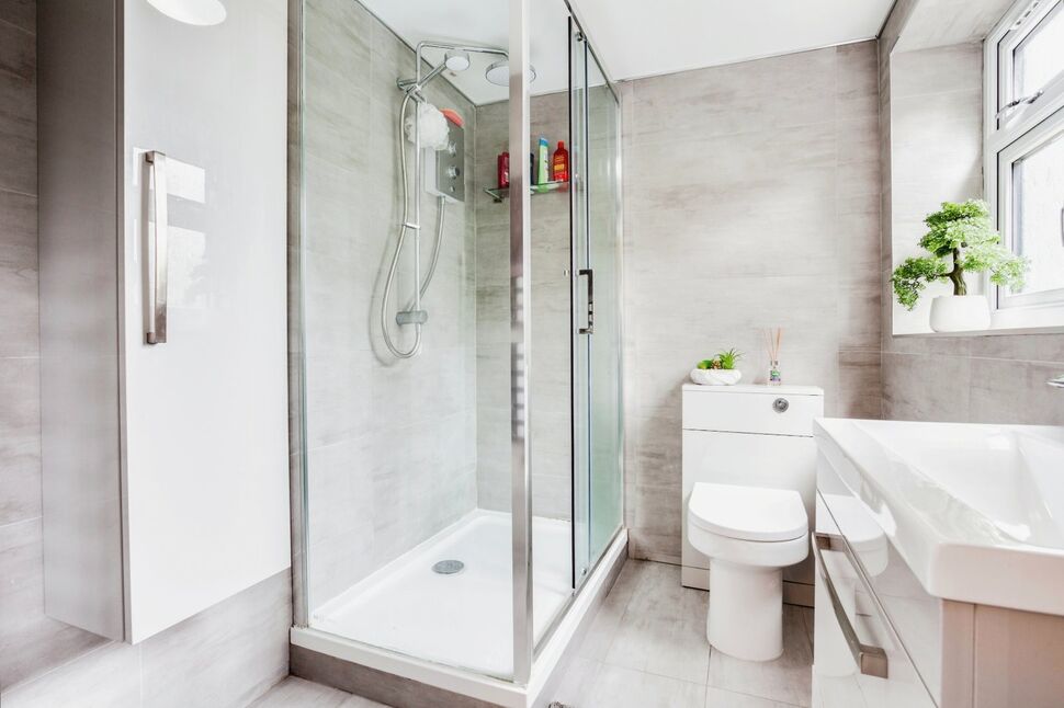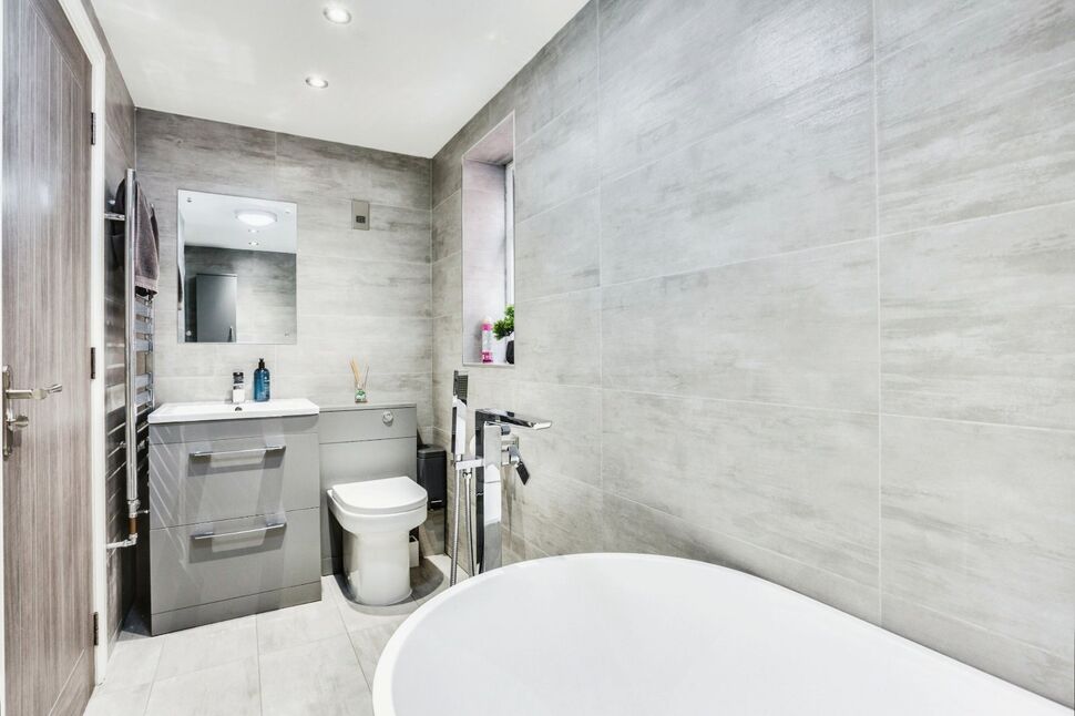 Fully tiled suite briefly comprising of shower cubicle, wash hand basin with vanity units, low level WC, heated towel radiator and uPVC double glazed frosted window.